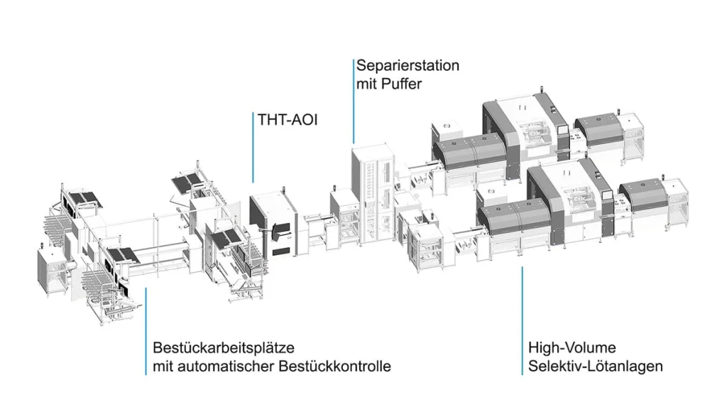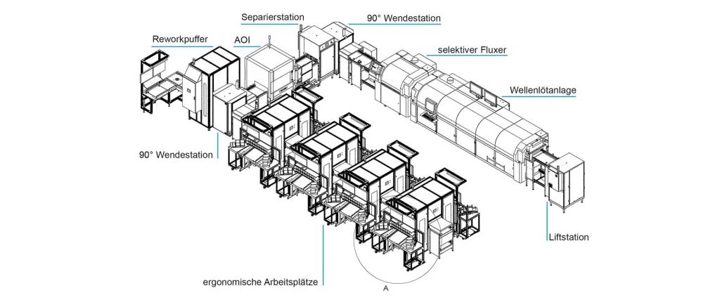 Die realisierte Linie auf nur 120 qm kombiniert ein U-Layout, ergonomische Bestückarbeitsplätze, automatische Lötrahmenübergaben, ein THT-AOI mit Bestückkontrolle und Lötstelleninspektion, und eine Wellenlötanlage zu einem durchgängigen Fertigungskonzept. Die automatische Rückführung fehlerhafter Baugruppen und die Steuerung der Lötrahmen über RFID sorgen für hohe Prozesssicherheit und klare Materialflüsse.